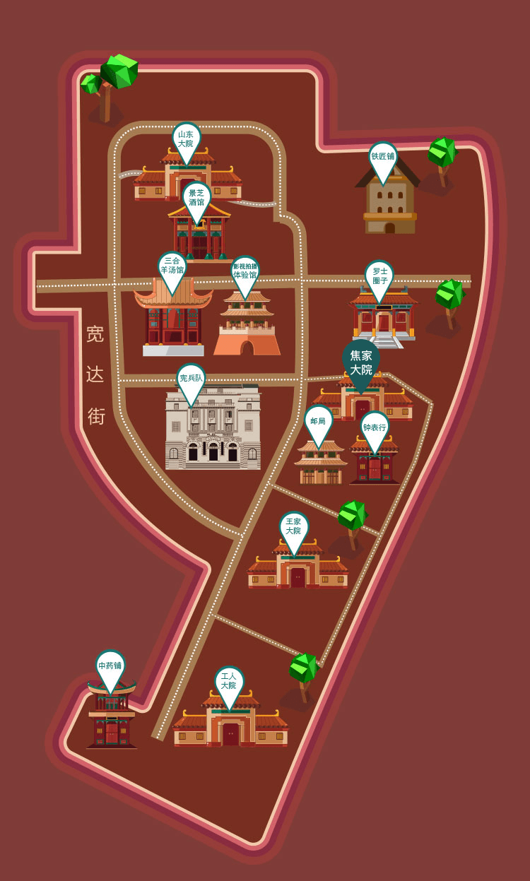 焦家大院是极具胶东特色的民居建筑海草房。在石块或砖石块混合垒起的屋墙上,有着高高隆起的屋脊,屋脊上面是质感蓬松、绷着渔网和海草的屋顶,使得屋内冬暖夏凉。在《闯关东》(中篇)中,焦家大院是一户普通的渔家宅院。